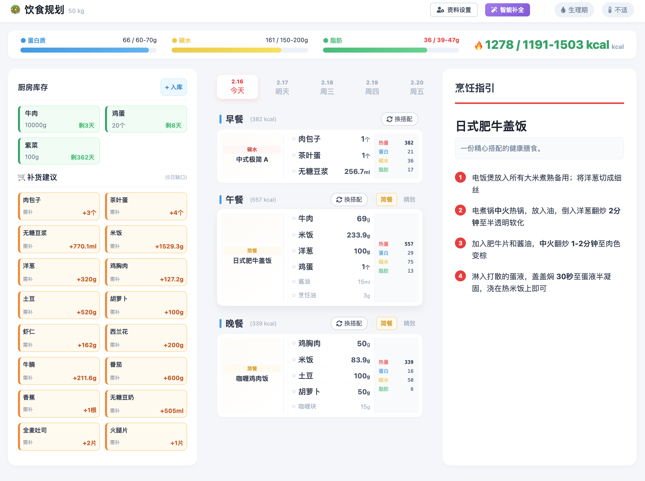 本周推荐:智能饮食规划 减少隐形家务,自动推荐健康菜谱,一键确认采购清单。